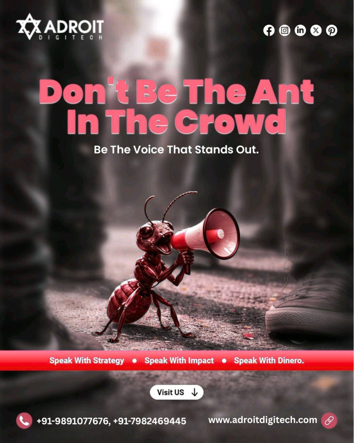In today’s overcrowded digital space, being visible is no longer enough—you must be memorable. Just like the powerful visual of a single ant holding a megaphone in a sea of moving feet, brands that speak with clarity, strategy, and confidence rise above the noise. This philosophy defines Adroit Digitech, one of the fastest-growing digital marketing agencies in Delhi NCR.